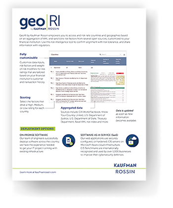 Now your team can assess and visualize your institution’s unique risks, benchmark against peers, screen against sanction lists, and even track and respond to regulatory orders.